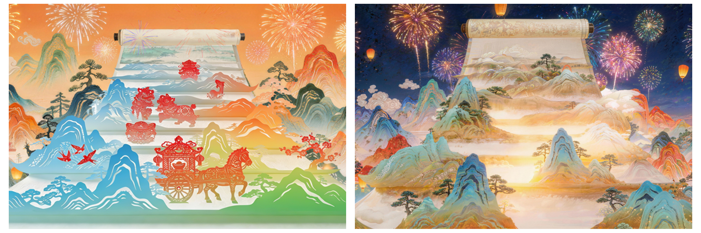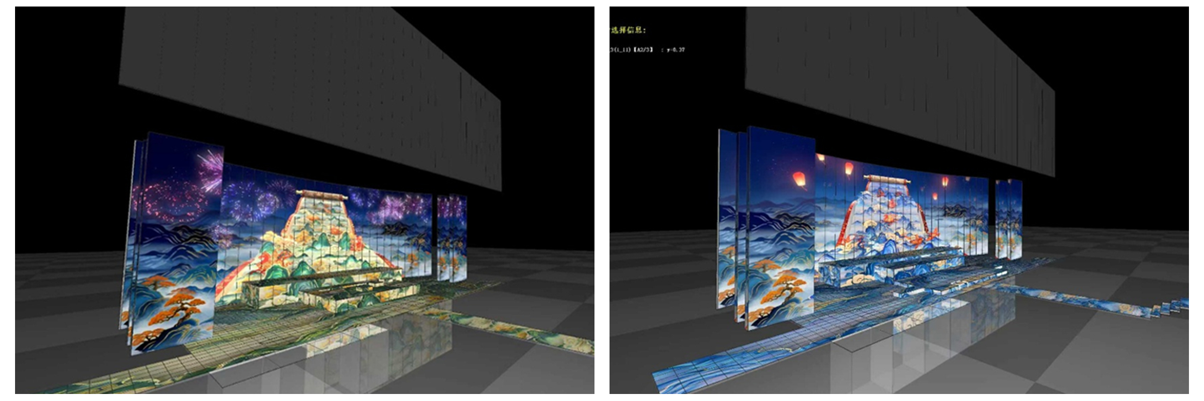 在《难忘今宵》方案推演阶段,学生围绕多条视觉路径开展多版创意方案,其中一版以非遗“龙鳞装”的层叠结构为意向,结合纸张动力学模拟与祖国山河、传统剪纸等意象的光效组织,进而提炼出可用于后续推演的空间运动语言与画面构成逻辑。