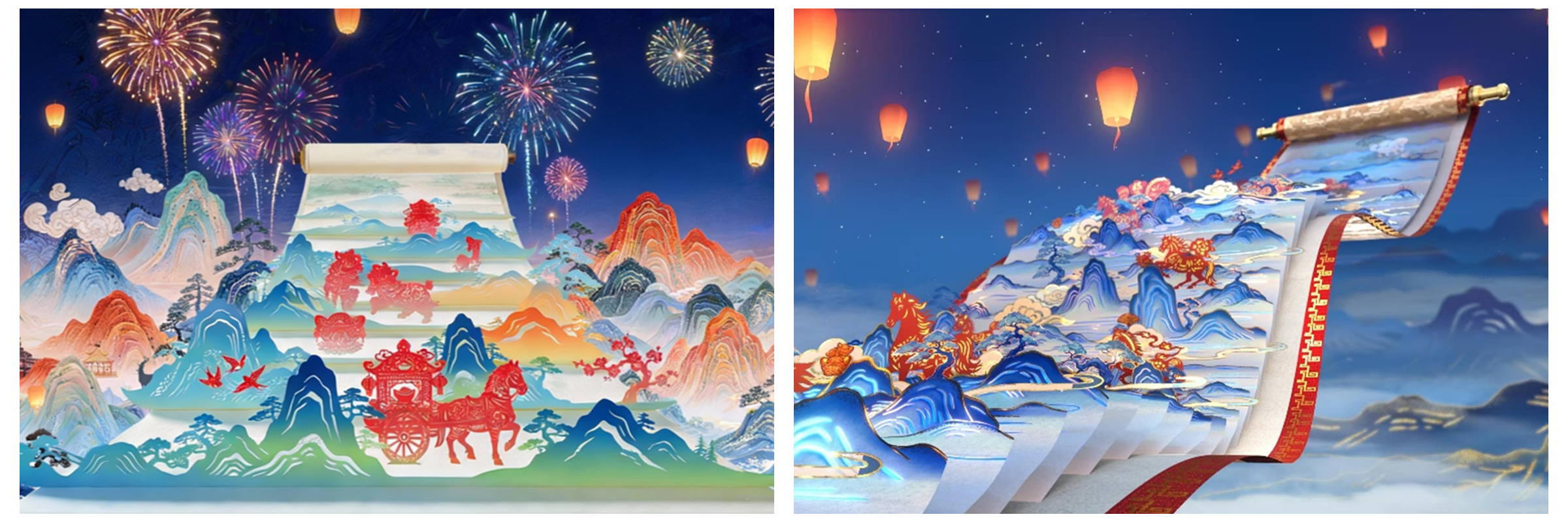 此外,视觉加入中国年味的典型元素“红灯笼”,灯笼由近及远穿行于窗前与楼宇之间,并由低至高缓缓升起,表达对新一年的美好祝愿。窗影的微幅晃动与星空背景相互呼应,构成可被感知的团圆叙事:人影对应烟火日常,星空指向时代远景。通过层级清晰的空间调度与光效组织,画面实现由铺陈到凝聚的情绪递进,形成“家国同心、灯火相连”的整体表达。