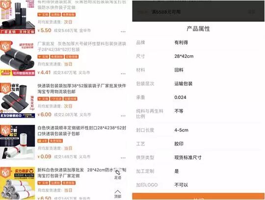 采购平台显示:出售的快递袋的材料大部分是"回收料"。