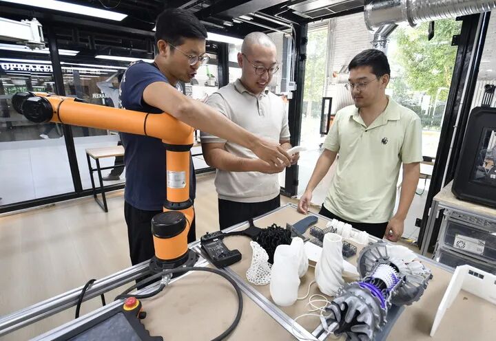 2025年9月19日,青年创业者在纪家庙双创产业园内的创意实践“梦工场”研究新材料产品。新华社记者 李欣 摄