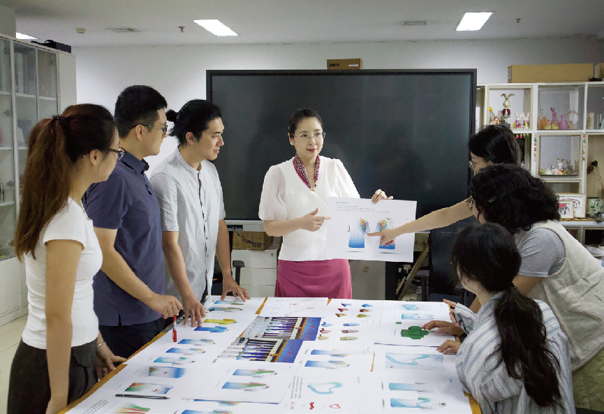夏小奇(中)教授带领纪念中国人民抗日战争暨世界反法西斯战争胜利80周年大会志愿者服装设计主创团队进行研讨
