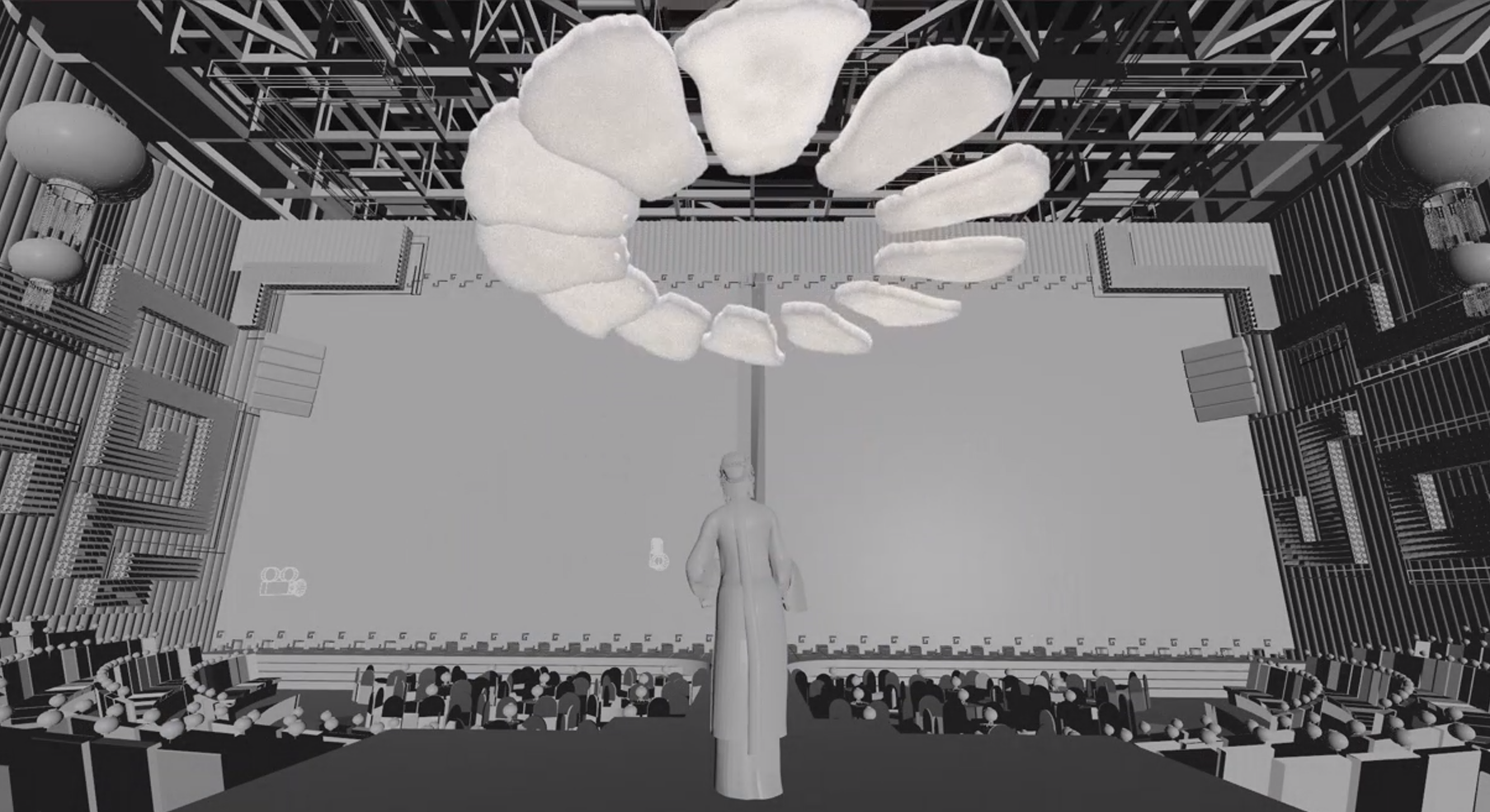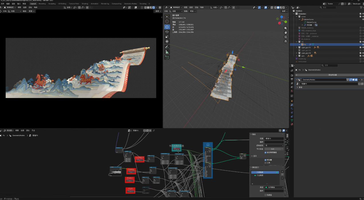 在《难忘今宵》方案推演阶段,学生围绕多条视觉路径开展多版创意方案,其中一版以非遗“龙鳞装”的层叠结构为意向,结合纸张动力学模拟与祖国山河、传统剪纸等意象的光效组织,进而提炼出可用于后续推演的空间运动语言与画面构成逻辑。