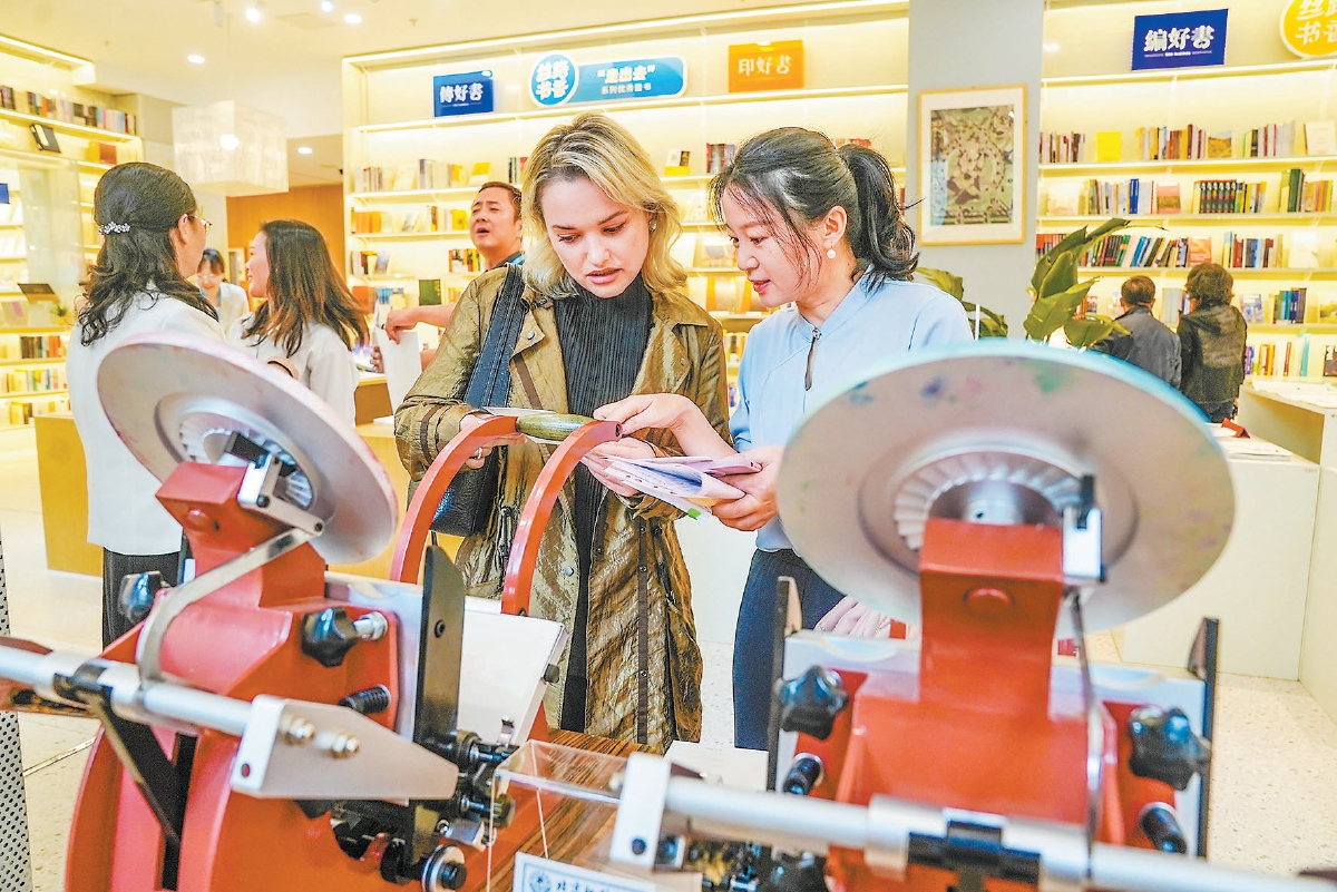 上图为中外嘉宾在“毕昇书坊”沉浸式体验印刷术的演变及其在当代文化中的应用。 本报记者 武亦彬摄