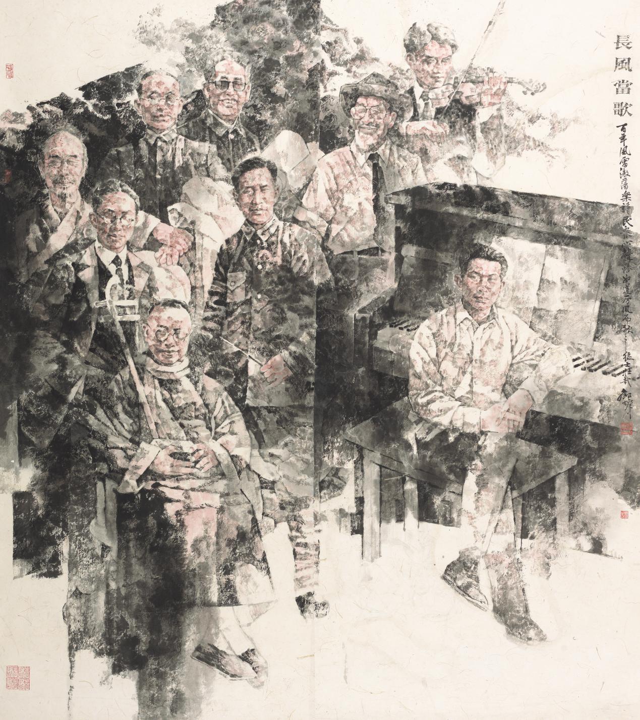 设计艺术学院教师邓灿中国画作品《长风当歌》作为2025年度国家艺术基金美术创作项目的立项作品入选该展览,这不仅是对其创作项目的进一步肯定,也生动体现了学院教师队伍的美术创作实力。这幅作品是邓灿音乐家题材作品的一次集中展示,描绘了聂耳、冼星海、刘天华等9位人民音乐家,他们为时代而歌,为人民而歌,他们的作品无愧于时代艺术的“高峰”。作品希望通过为这些人民音乐家“树碑立传”,激励当代艺术家们勇攀艺术高峰。