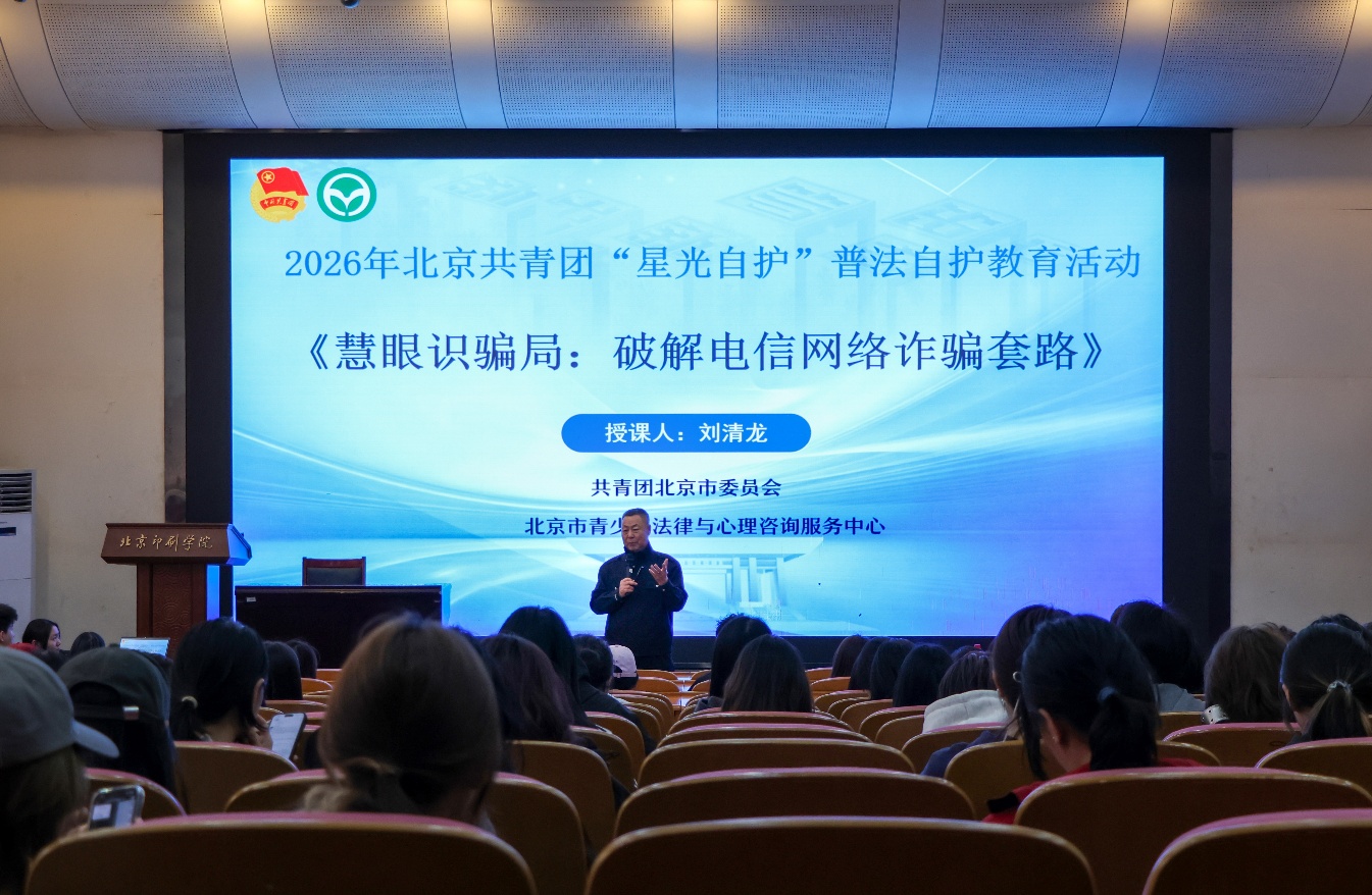 为深入推进平安校园建设,切实增强学生防范电信网络诈骗的意识和能力,4月1日下午,学校在综合楼报告厅举办“慧眼识骗局:破解电信网络诈骗套路”专题培训活动。本次活动是2026年北京共青团“星光自护”普法自护教育活动的重要内容之一,特邀北京市青少年法律与心理咨询服务中心刘清龙老师担任主讲嘉宾,学校各二级学院学生代表参加活动。