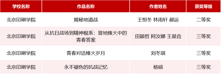 学校将此次征集活动作为纪念中国人民抗日战争暨世界反法西斯战争胜利80周年系列教育活动的重要举措,党委学工部积极组织学生参与活动,经单位推荐、专家评审、网络展示等环节,学校报送的4部学生作品脱颖而出,获二等奖1项、三等奖3项。