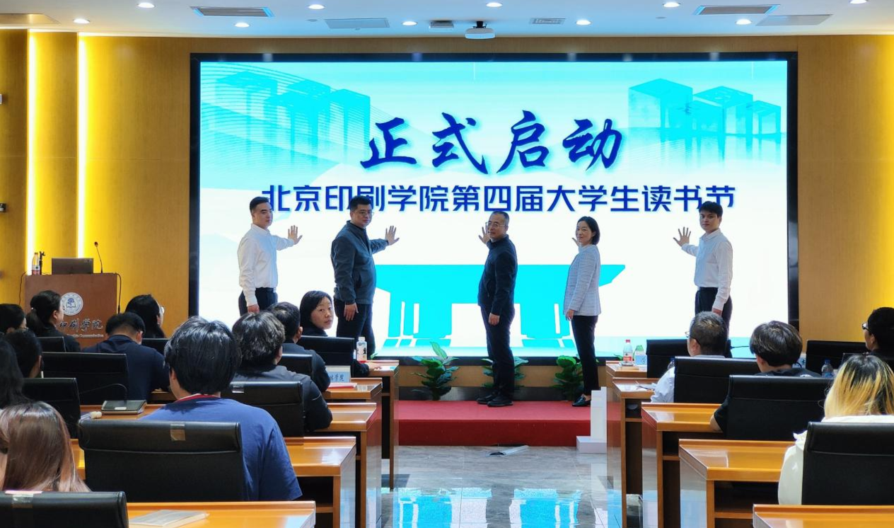 刘杰民、王新营、学工部部长朱磊、学生代表共同开启“书蕴芳华”校园读书季暨北京印刷学院第四届大学生读书节启动仪式。