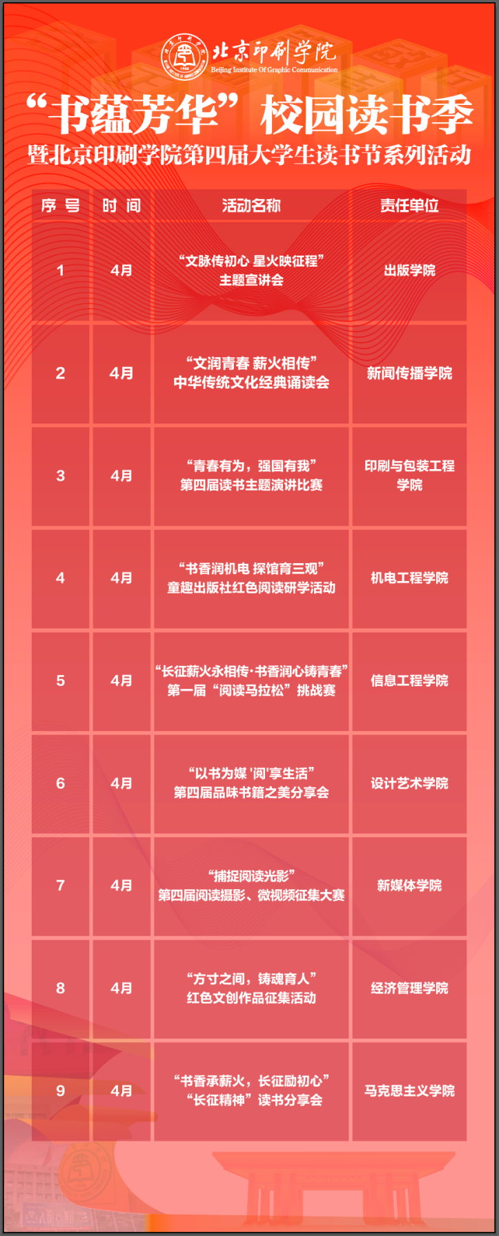 在全国首个“全民阅读活动周”到来之际,为进一步推动学生思想政治工作高质量发展,落实《全民阅读促进条例》,形成“阅读北印”“书香北印”“文化北印”的良好氛围,在青年学子中厚植阅读文化、涵育出版初心,学工部发布了第四届读书节活动方案,各学院充分发挥学科专业优势,深入开展“书蕴芳华”校园读书季暨学校第四届大学生读书节系列主题活动。活动涵盖主题宣讲会、中华经典诵读会、读书演讲比赛、红色阅读研学活动、“阅读马拉松”挑战赛、“长征精神”读书分享会等9项活动。