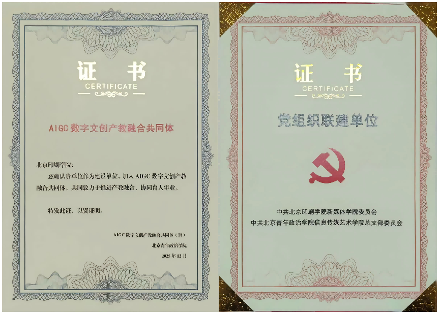 12月19日,数字文化创意产教融合推进会在北京青年政治学院举办,大会正式启动“北京数智文化创意产教联合体”与“AIGC数字文创产教融合共同体”,北京印刷学院成为首批“AIGC数字文创产教融合共同体”理事单位,新媒体学院党委成为“两体”党建联建单位。新媒体学院党委书记赵欣、副院长袁园受邀参会。