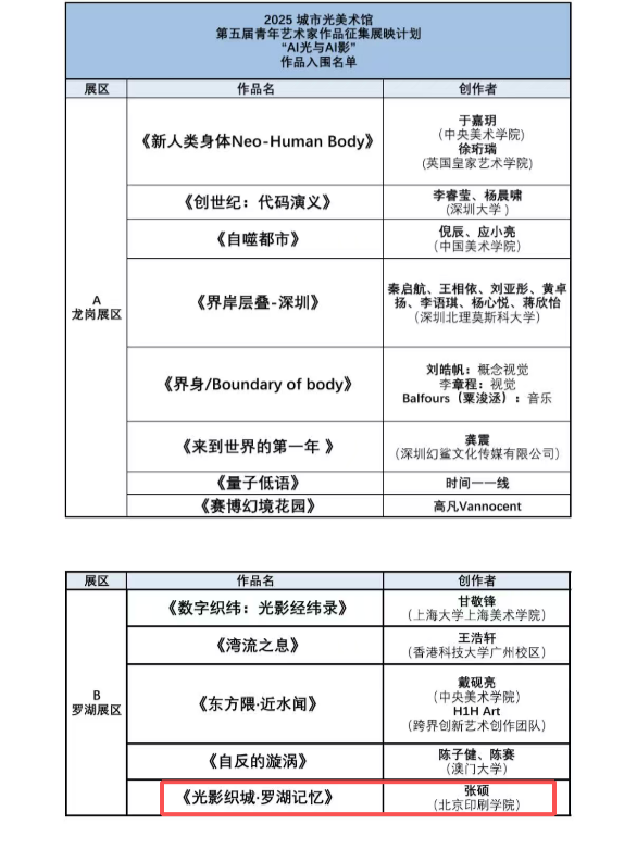 近日,深圳城市光美术馆“AI光与AI影”第五届青年艺术家作品征集展映计划公布入选名单,学校新媒体学院设计专业硕士研究生张硕的作品《光影织城·罗湖记忆》成功入选。该作品于2026年1月16日至4月26日,在深圳罗湖区金啤坊艺术街区筒仓森林展出,以AI光影艺术为纽带,搭建工业遗产与数字时代的对话桥梁。