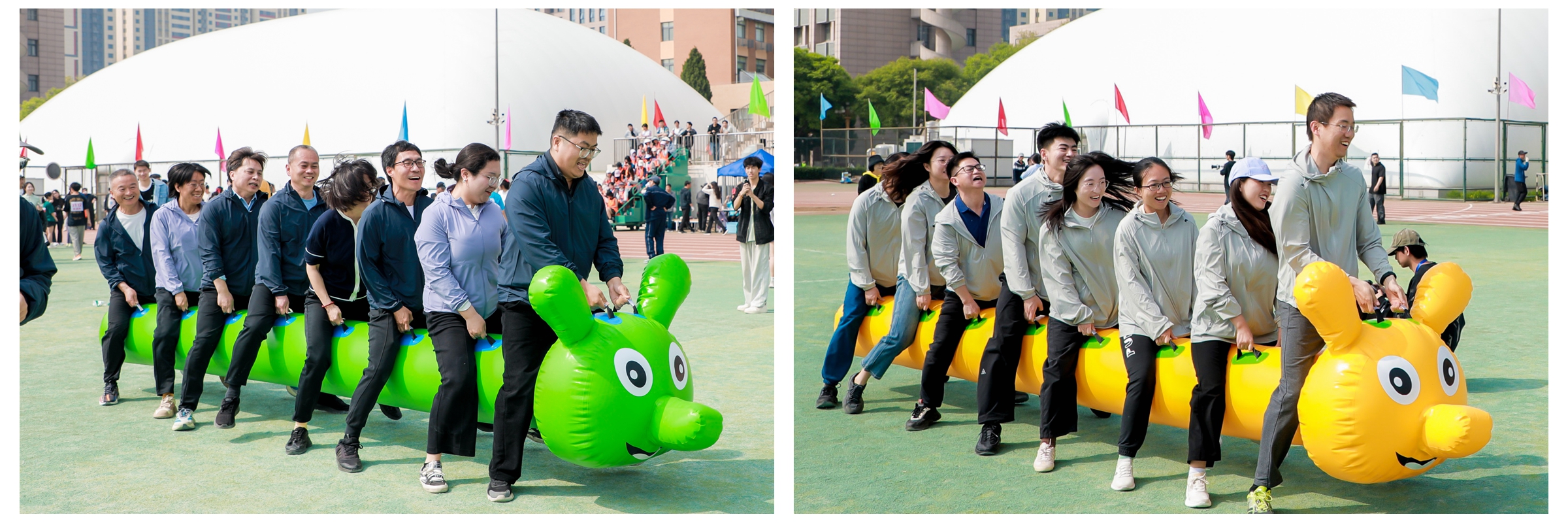 “疯狂毛毛虫”作为趣味运动会的热门项目,考验团队步调一致性的同时更考验每位选手自身协调能力。握紧把手、提起“虫身”,坐在“毛毛虫”身上选手齐念口号共同前进。“有创意、趣味性高”出版学院李司轶老师对此项目赞不绝口。
