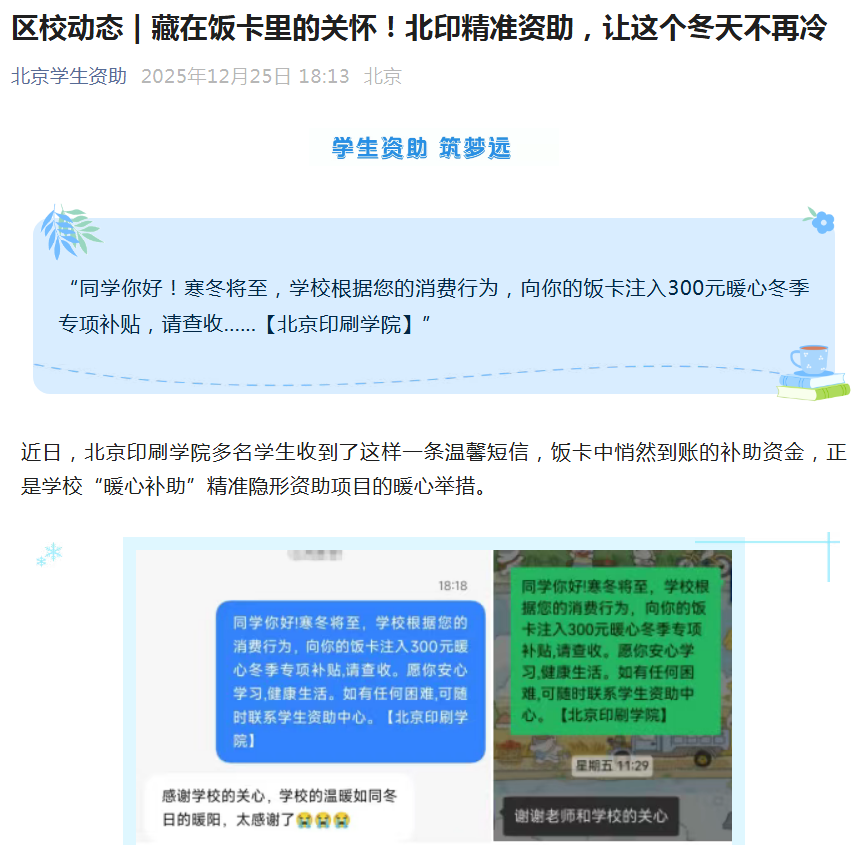 学校着力推进学生资助工作从“保障型资助”向“发展型资助”转型升级,积极探索“大数据”与资助工作相融合的创新路径,精心打造了“暖心补助”精准隐形资助品牌项目。该项目通过智能分析校园一卡通消费数据,主动识别经济困难学生,实现“无感帮扶、隐形赋能”,突破了传统资助的局限性,体现了资助工作的精细化与人性化,相关创新内容被北京学生资助公众号专栏推送。