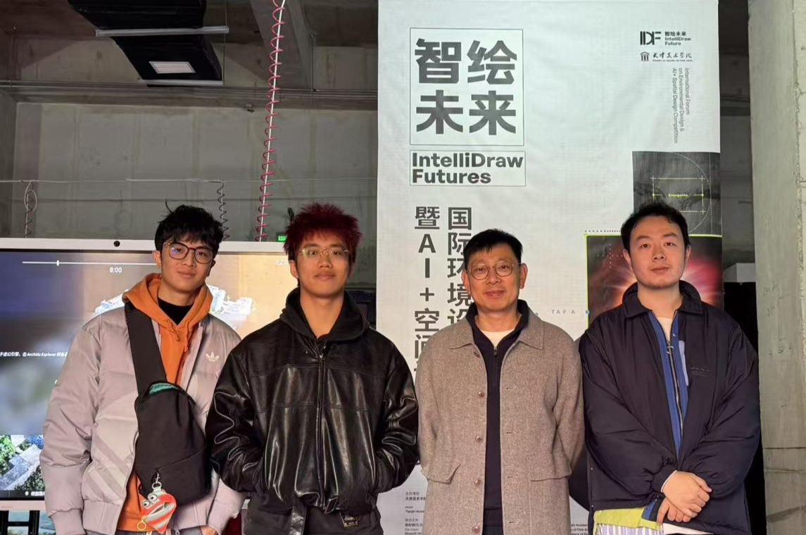 绘未来,光影随行。11月,由天津美术学院主办的“智绘未来——国际环境设计学者论坛暨AI+空间设计大赛”于天美艺术街区举行。作为环境设计与数字艺术领域的年度前沿学术活动,本次展览汇聚了国内外众多创新设计成果。在展览核心区域,一套由主办方部署的动态轨道镜导览系统吸引了众多目光。而赋予这套硬件以生命、使其成为灵动虚拟向导“艾可”的核心视觉内容开发与动态影像创作,是由学校新媒体学院新媒体艺术专业的师生团队设计完成,团队成员为2023级新媒体艺术专业袁嘉泽、李昱辰、童思皓,指导教师为刘润泽、袁园。