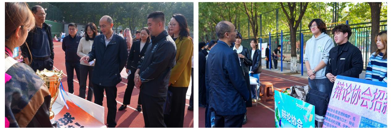 10月15日下午,学校2025年社团文化节在康庄校区体育场举办。学校党委书记张鑫,党委常委、宣传部部长王新营以及学校党政办、学工部、教务处、后勤处、校团委、基础教育学院、各二级学院相关负责人走进活动现场,了解学生社团管理、建设及招新情况,并与同学们深入交流。