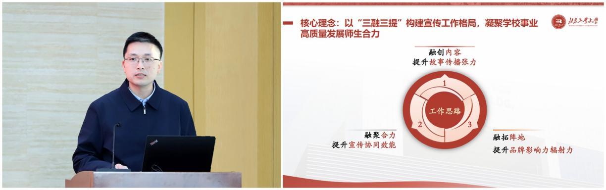 在工作交流环节,获奖代表分享了实践经验。“新闻宣传先进集体”获奖单位代表、设计艺术学院党委书记史民峰围绕如何结合专业特色开展宣传进行介绍;“优秀新媒体账号”获奖单位代表、校团委书记王昕分享了新媒体平台运营与青年思想引领的心得;“新闻宣传先进个人”获奖者、新闻传播学院孟艳芳老师结合自身工作,讲述了讲好北印故事、传播北印声音的体会。