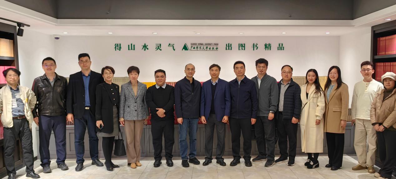 在广西师范大学出版社集团,张鑫一行参观了“独秀书房”和社史馆,深入了解出版社在精品出版、品牌运营、融合发展等方面的先进经验,并与广西师范大学党委副书记黄文韬、副校长黄晓娟、出版社总经理黄毓、文学院院长冯智明等座谈交流。双方围绕学科建设、师资培养、科研协作、研究生联合培养等方面深入交流,并就依托各自办学特色,加强协同创新,深化高层次出版人才培养和有组织科研达成共识,共同探索校际合作共赢新模式。