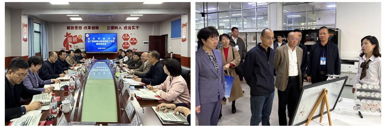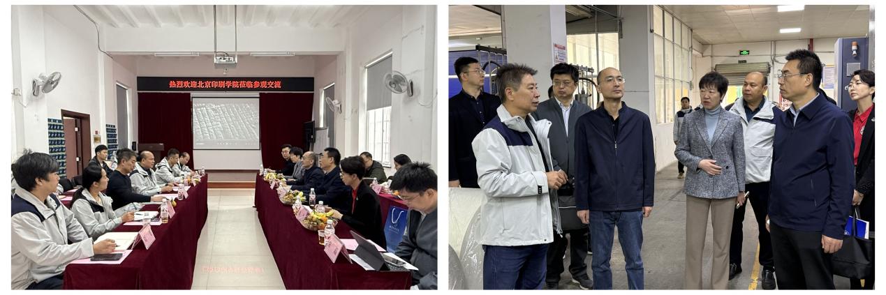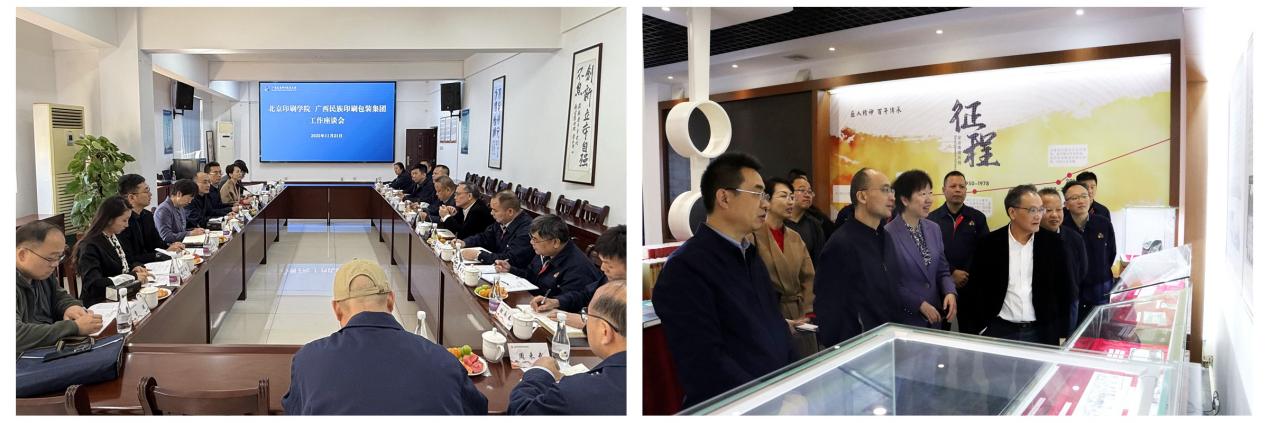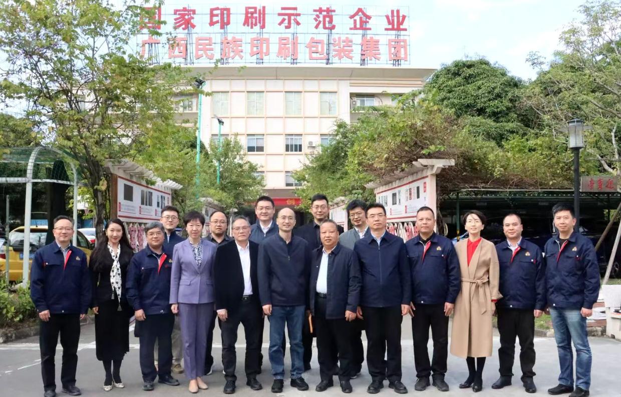 在广西民族印刷包装集团,张鑫一行深入生产车间一线,详细了解企业智能化改造情况,并与集团党委书记、董事长韦鸿学,总经理韦志江等座谈。校企双方就共建实习实训基地、联合技术攻关、“订单式”人才培养等合作模式进行了深入交流。
