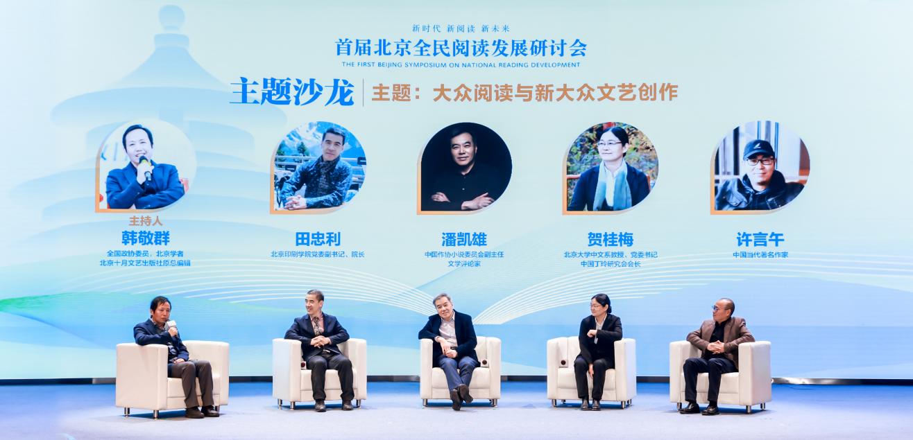 韩敬群主持“大众阅读与新大众文艺创作”主题沙龙,田忠利、潘凯雄、贺桂梅、许言午围绕大众阅读新趋势、新大众文艺新表达、优质内容生产传播等议题展开研讨。田忠利谈到,阅读对大学生非常重要,它是知识的传授,也是国家所倡导的全民阅读重要战略支点。北京印刷学院致力于从三个维度推进全民阅读工作:一是站在文化强国的高度,把阅读作为人才培养立德树人的核心途径。二是站在出版使命的高度,培养学生成为未来出版家、传媒人的社会担当,通过阅读提升他们作为未来出版先锋的引领力。三是站在民族复兴的高度上,通过阅读涵养学生文化自信和精神独立,夯实青年一代的精神底色。潘凯雄谈到,新大众文艺创作的新,不在于身份的设定与更换,不是简单的“素人写作”,而是将写作的立场、态度、关注点放在广大读者身上,才能创作出更精品的内容,繁荣文艺事业。贺桂梅谈到,阅读变得具有大众性是伴随印刷文化发展的。当下新大众文艺创作需要关注两点:一是新大众文艺处于互联网条件,强调了传播媒介变化,与新的传播技术、信息技术、媒介技术密切结合。二是新大众文艺是全民性的、大众性的拓展,不拘一格,激发全民族的文艺创作活力。许言午谈到,互联网条件下发展新大众文艺,重点是要拓宽视野,用开放包容的态度去创作,以小我写大众,才能发现更精彩的大众万象。