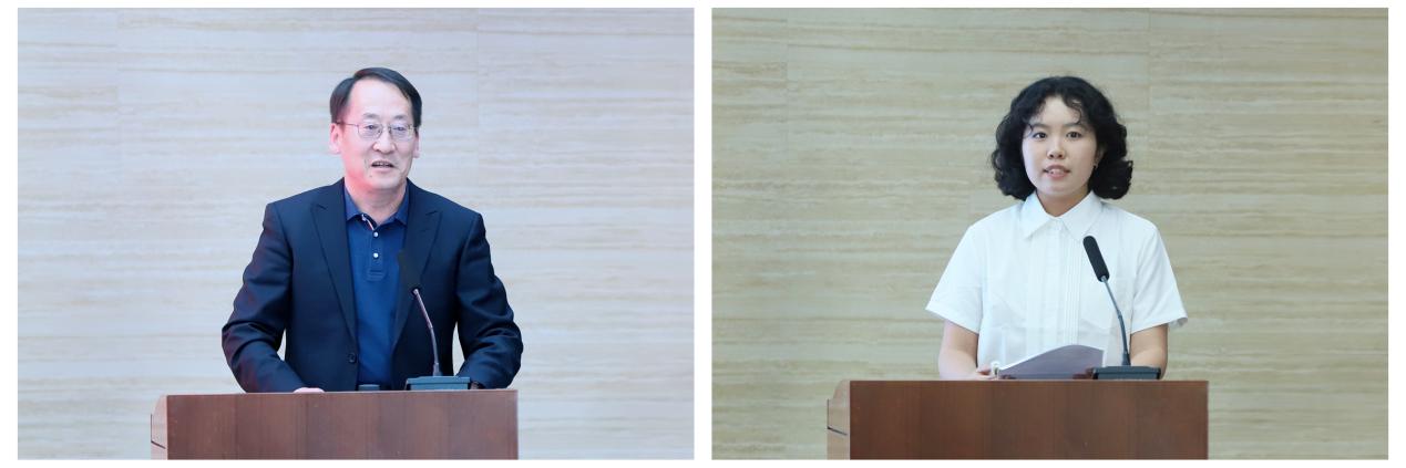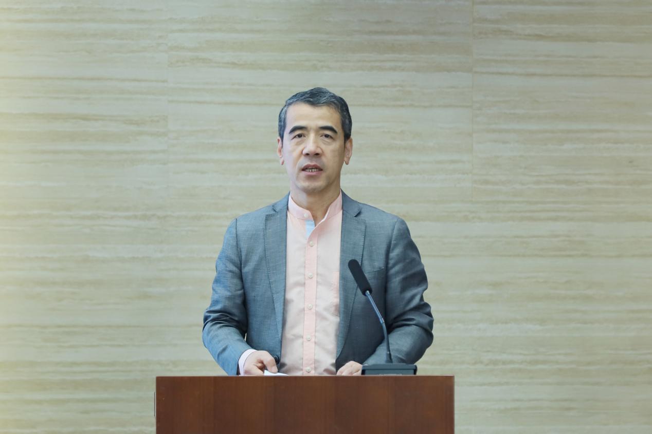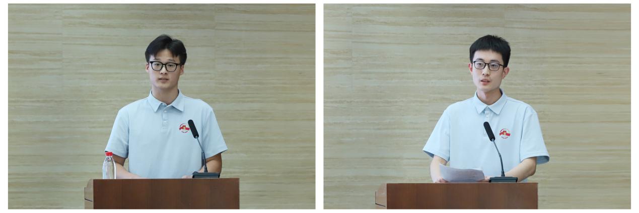 马克思主义学院党总支书记高杨文介绍“服务保障重大活动学生‘讲一次思政课’”工作安排。出版学院博士研究生许恬溪、经济管理学院硕士研究生曹凯和新闻传播学院本科生葛珺修作为服务保障重大活动学生宣讲团代表进行主题宣讲。