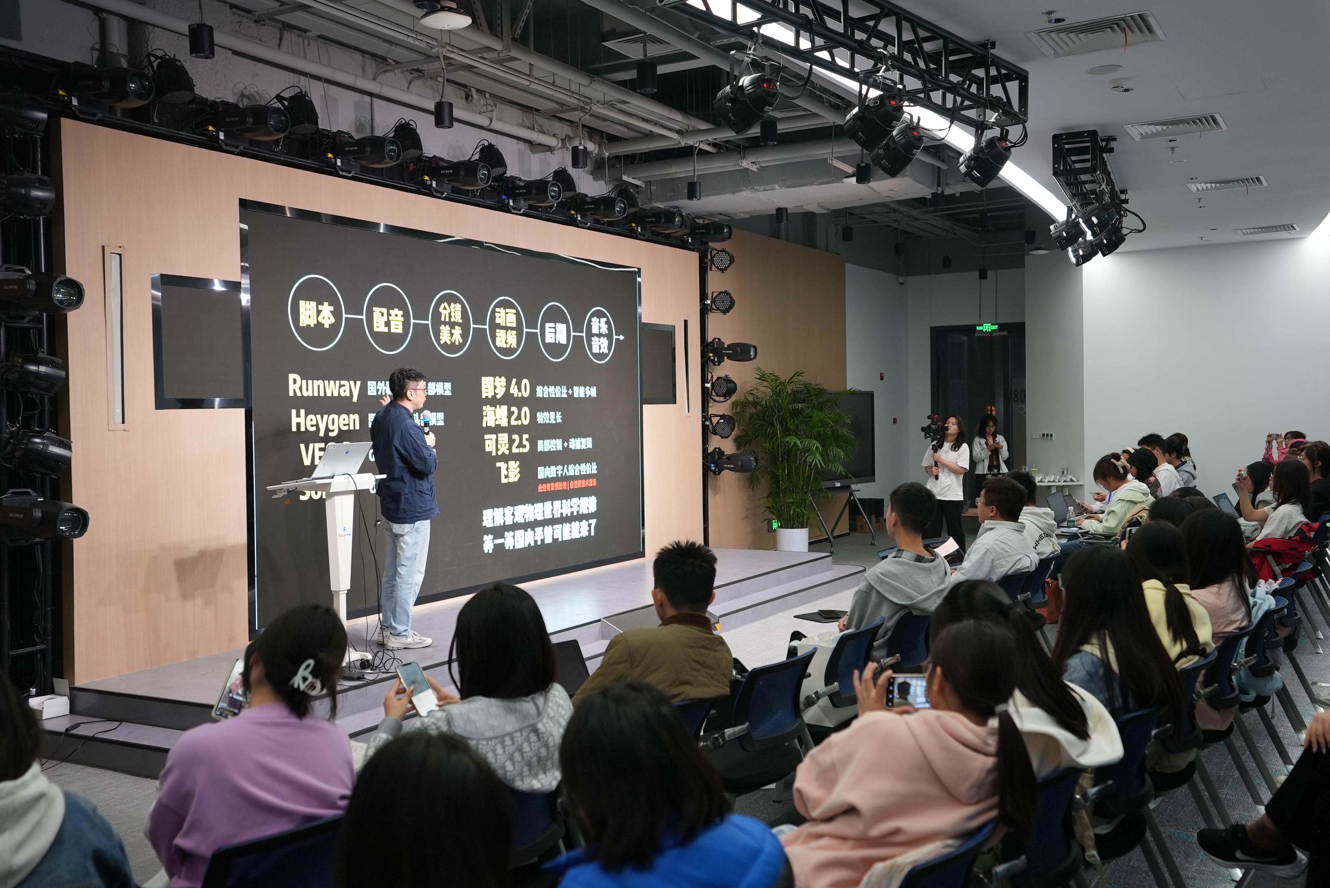 活动的另一大亮点是AI创作实战环节,企业技术专家李政以“一个人的影视团队——AI动画视频生成指南”为主题,带领同学们走进AI创作。从“这个AI能做吗”的疑问出发,由工具推荐、技巧拆解到案例展示,讲解层层递进,现场指导同学们实操训练,让同学们深刻感受到了技术变革为内容创作带来的无限可能——“一人成队”的影视创作模式从概念走向了现实体验。