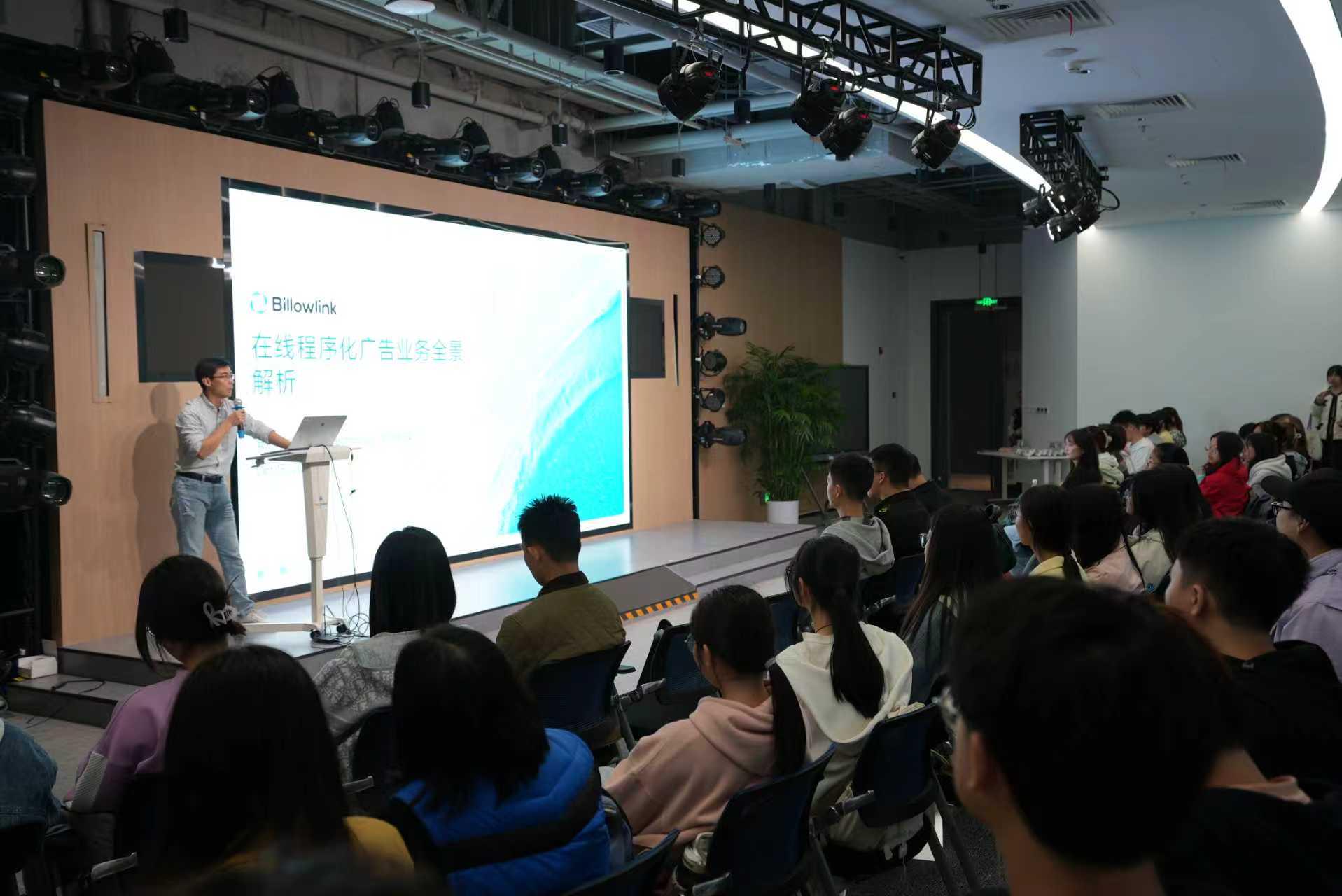 在行业分享环节,Billow巨浪科技的联合创始人王骞以“互联网商业化核心密钥——在线程序化广告”为题作专题讲座。从广告的本质出发,王骞系统梳理程序化广告的发展脉络,并将DSP(需求方平台)和RTB(实时竞价)等专业概念转化为清晰易懂的商业逻辑,揭示了大数据如何赋能广告的精准触达,为同学们理解互联网广告生态提供了关键框架。