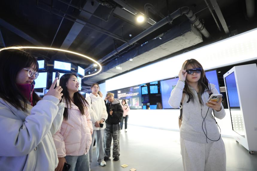 在数智创新中心,同学们还亲身体验了入驻园区的高新科技企业——北京汉提科技有限公司的最新产品成果“入目”AR智能眼镜。同学们戴上轻巧的眼镜,立刻被其智能功能所吸引:片源能够自动识别,在2D、3D与全景视频模式间无缝切换,带来极具沉浸感的视觉盛宴;其超清智慧办公解决方案,更是让远程线上交流宛若“面对面”互动。这一创新产品让同学们直观感受到,科技如何具体而微地赋能工作与生活。
