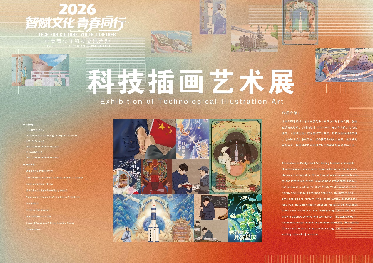 2026年是中美“乒乓外交”55周年,4月8日,“智赋文化 青春同行”中美青少年科技交流活动在中国科学技术馆举办。学校设计艺术学院师生携原创科技主题插画展精彩亮相本次国际交流盛会,以艺术创意诠释科技兴国内涵,用视觉作品搭建中美青少年文化互通桥梁,充分展现北印青年的艺术创造力与文化担当。