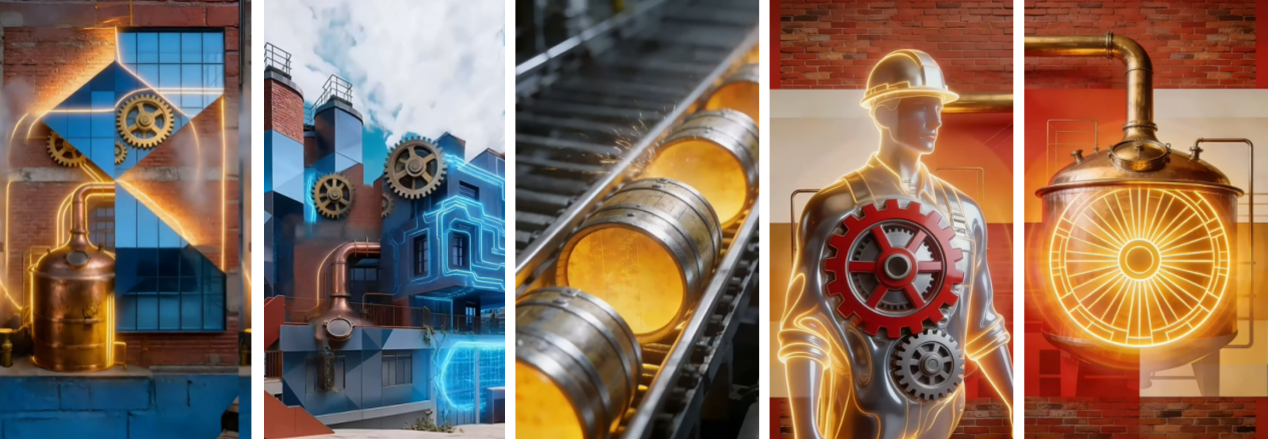 入选作品《光影织城·罗湖记忆》以金啤坊工业遗产为基底,用抽象超现实光影语言,提取红砖、糖化锅、运输轨道等专属工业符号,拆解为流动光影粒子,让老厂房记忆与AI科技形成时空交织。作品以AI生成影像,暖黄光影唤醒工业遗产生命力,冷蓝光影勾勒技术重构轨迹,二者碰撞共生,既以“光”激活记忆,又以“影”反思技术中的人文温度。高对比色彩适配户外展映,无缝循环设计满足长期呈现需求,在直观视觉表达中,传递对AI与工业记忆本真关系的思考,守护技术重构下的人文内核。