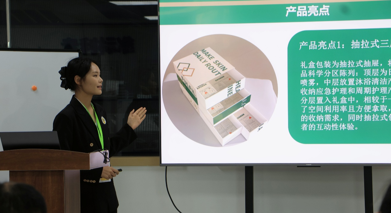 全国化妆品大赛总决赛《芙芙抽屉式祛痘礼盒包装宣传设计》答辩现场