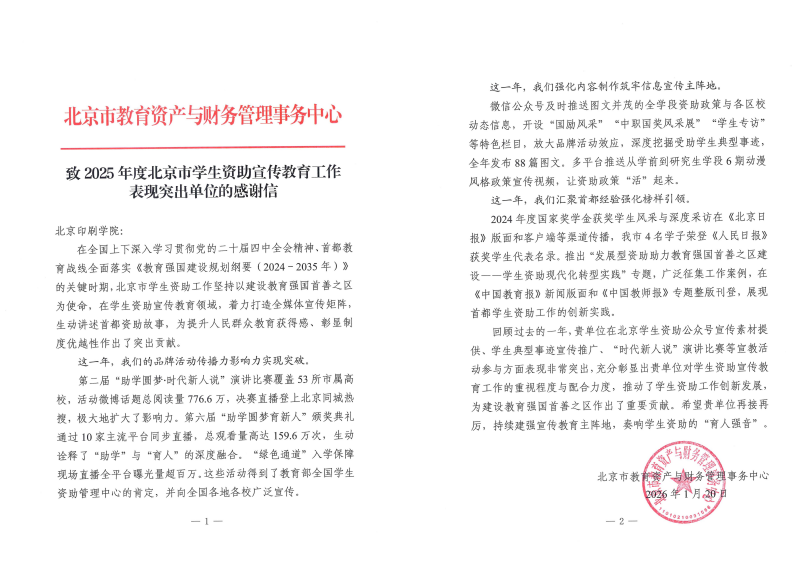 近日,北京市教育资产与财务管理事务中心特向学校发来感谢信,对学校在2025年学生资助宣传教育工作中作出的突出贡献予以充分肯定。