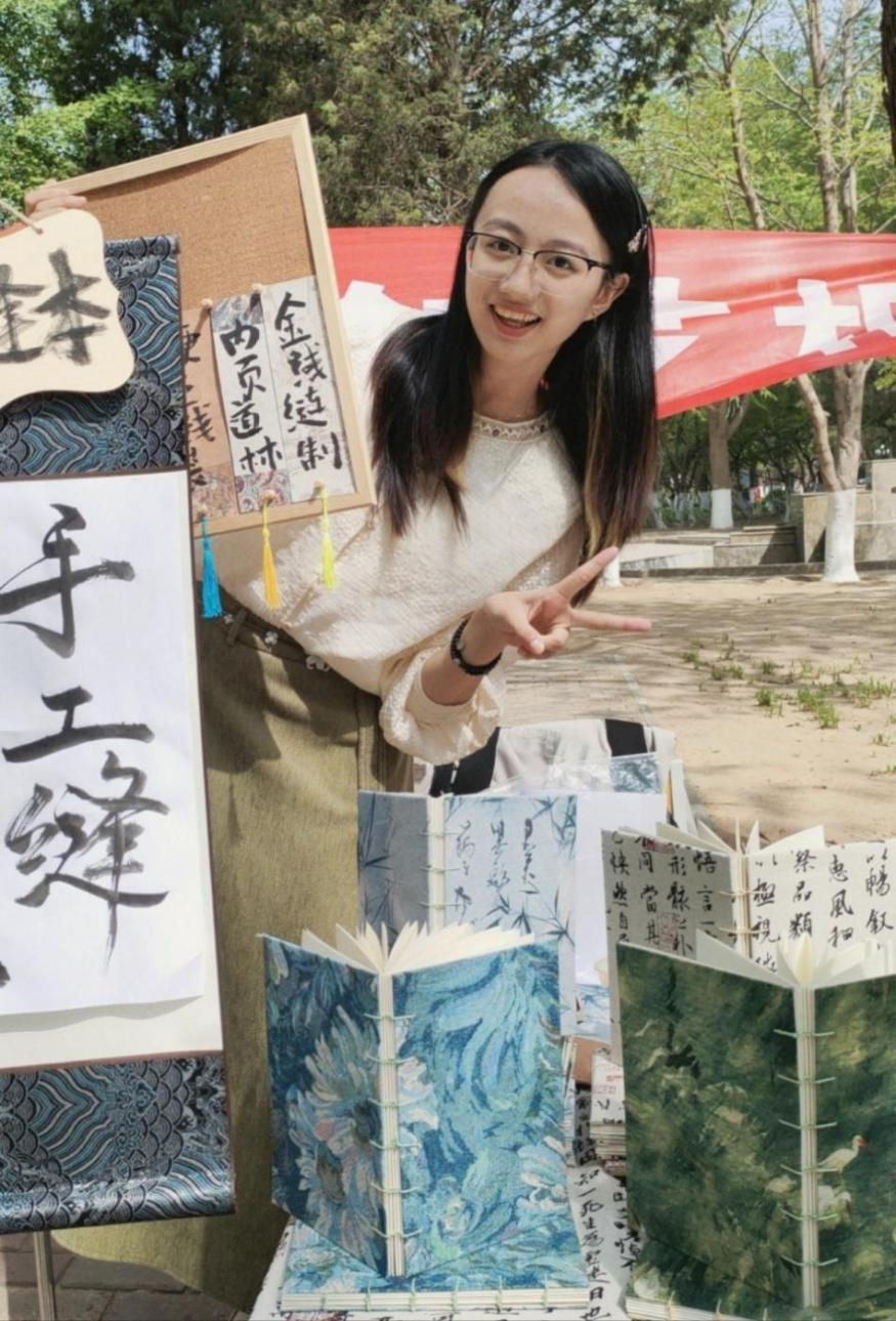 今年四月,学校举办“春日拾趣,创艺相逢”主题创意集市,窦方廷选择制作“手缝本”作为原创手工作品进行展示。创作这款作品的灵感来源于古代线装书,通过手工缝制实现小批量制作。选纸、针孔间距等微小的细节都在考验着制作者的经验,“制作中最大的困难是技艺不够纯熟。”为此,她查阅了大量历史资料和现代工艺视频,反复调整修改。在集市销售过程中,她还与包装专业的同学们进行了交流,讨论如何精进技术,使作品更精致、更牢固。